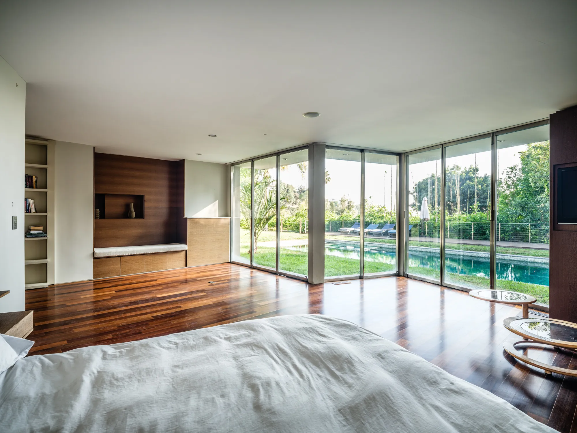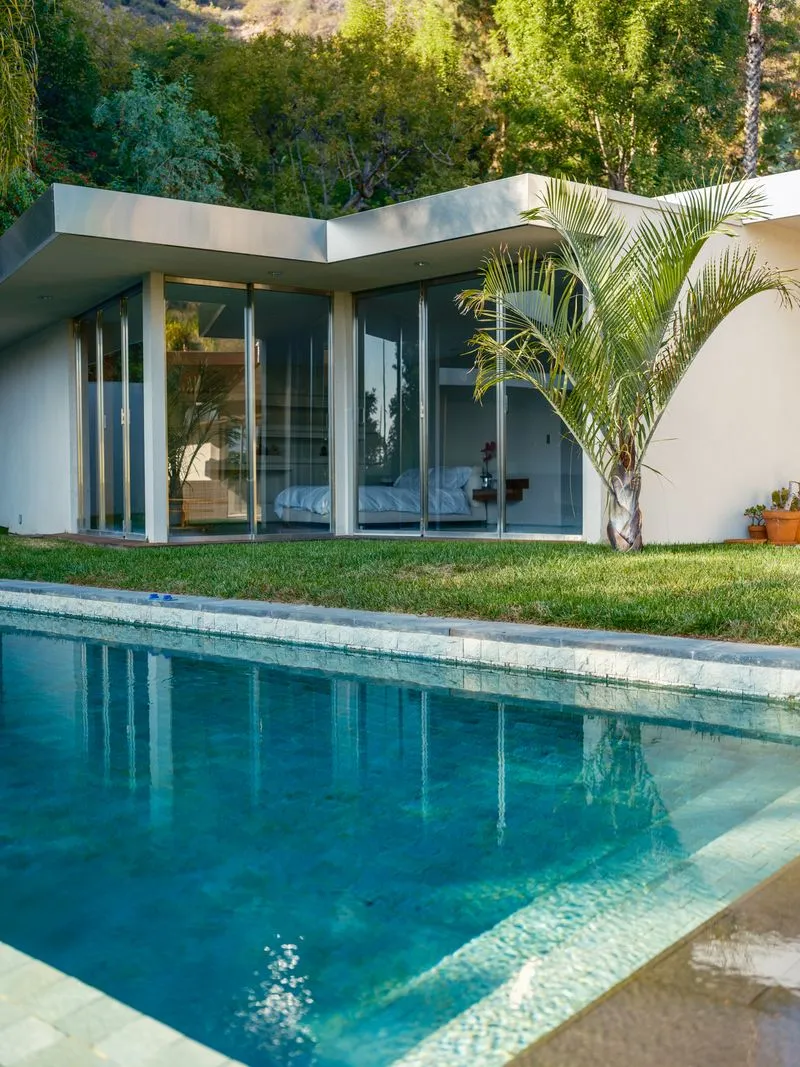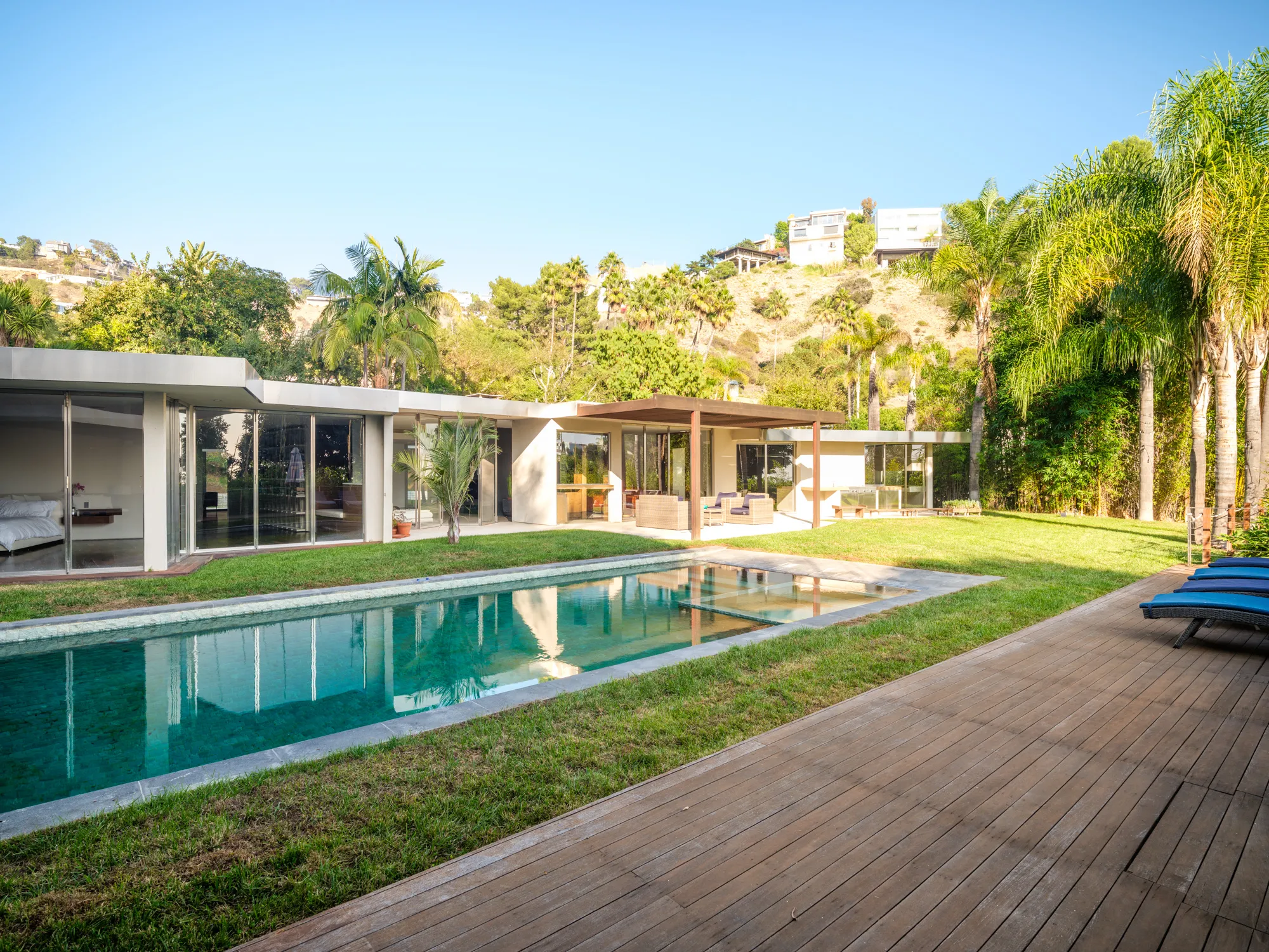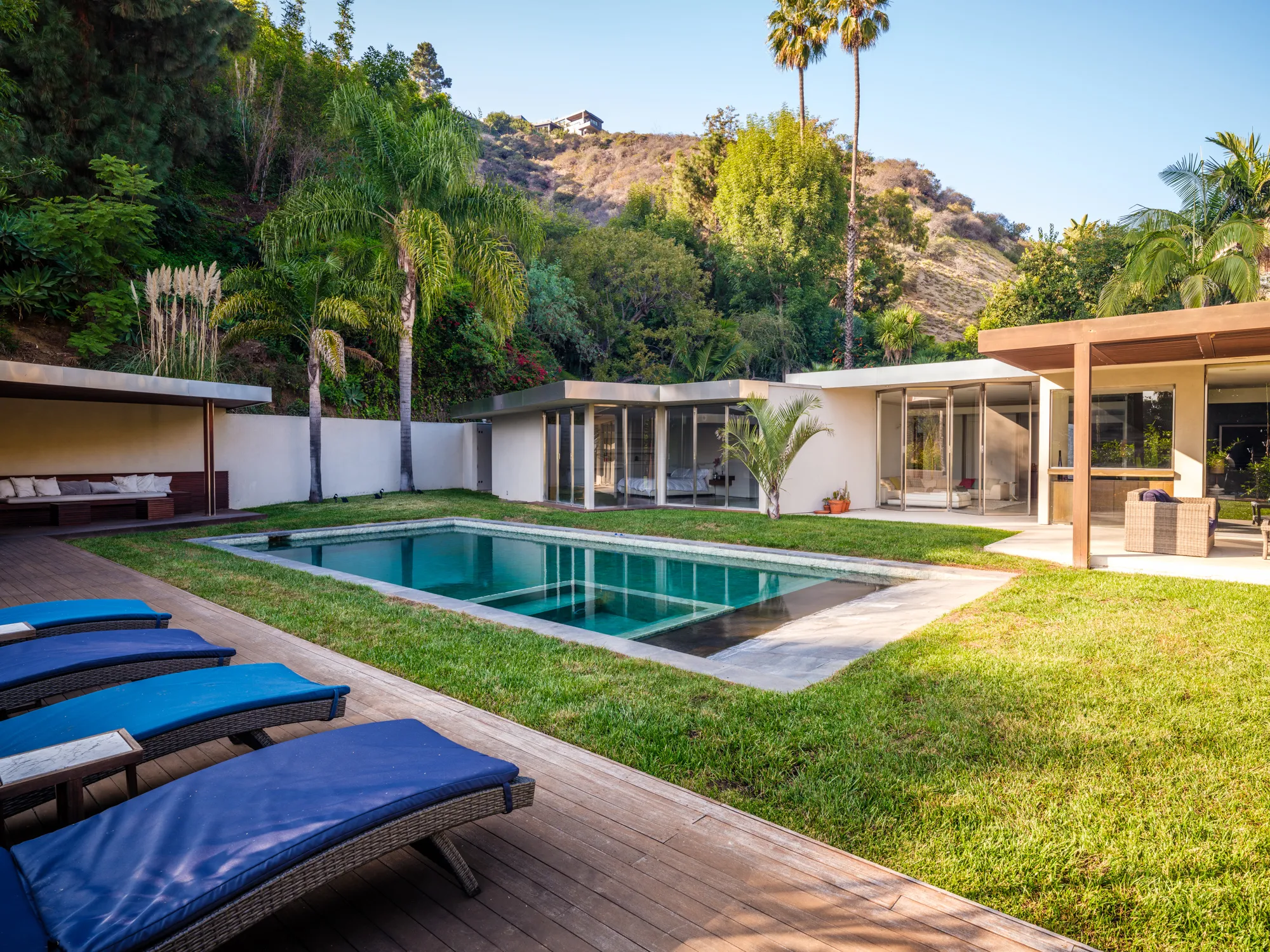 An extraordinary California mid-century modern (1958) reimagined by noted designer Janna Levenstein (2008), the residence has been photographed by Architectural Digest amongst others. Situated in one of the most coveted, high-wattage enclaves of the Bird Street environs, Rising Glen Road. Large, private and light-filled, 1615 Rising Glen lives on a single level indoors, and out with walls intentionally positioned for major works. Mid-century architecture rarely comes in a size and scale like this living in almost 4000sf. Substantial open spaces are voluminous which blend with the outdoors by way of custom folding walls of steel and glass. All main living spaces open widely to an overwhelmingly large flat lot of over half of one acre - with pool and direct views of the city. Terrazzo floors, cantilevered fireplaces and high coved ceilings remain as originally designed. Graciously sized master suite with walk-in closet, home theater and gourmet European kitchen which pulls in the outdoors seamlessly. Additional amenities include Crestron home automation and 3-car garage with secured gated entry. Extremely private and gated.