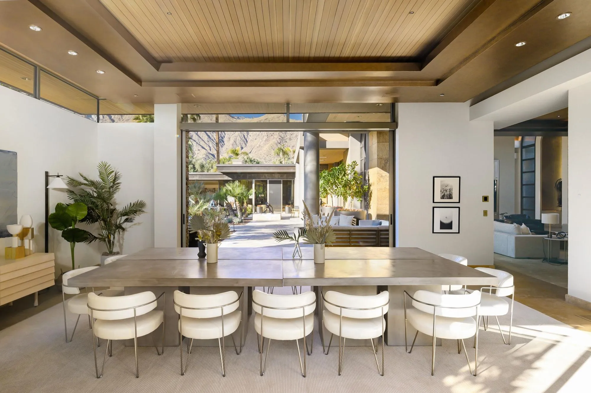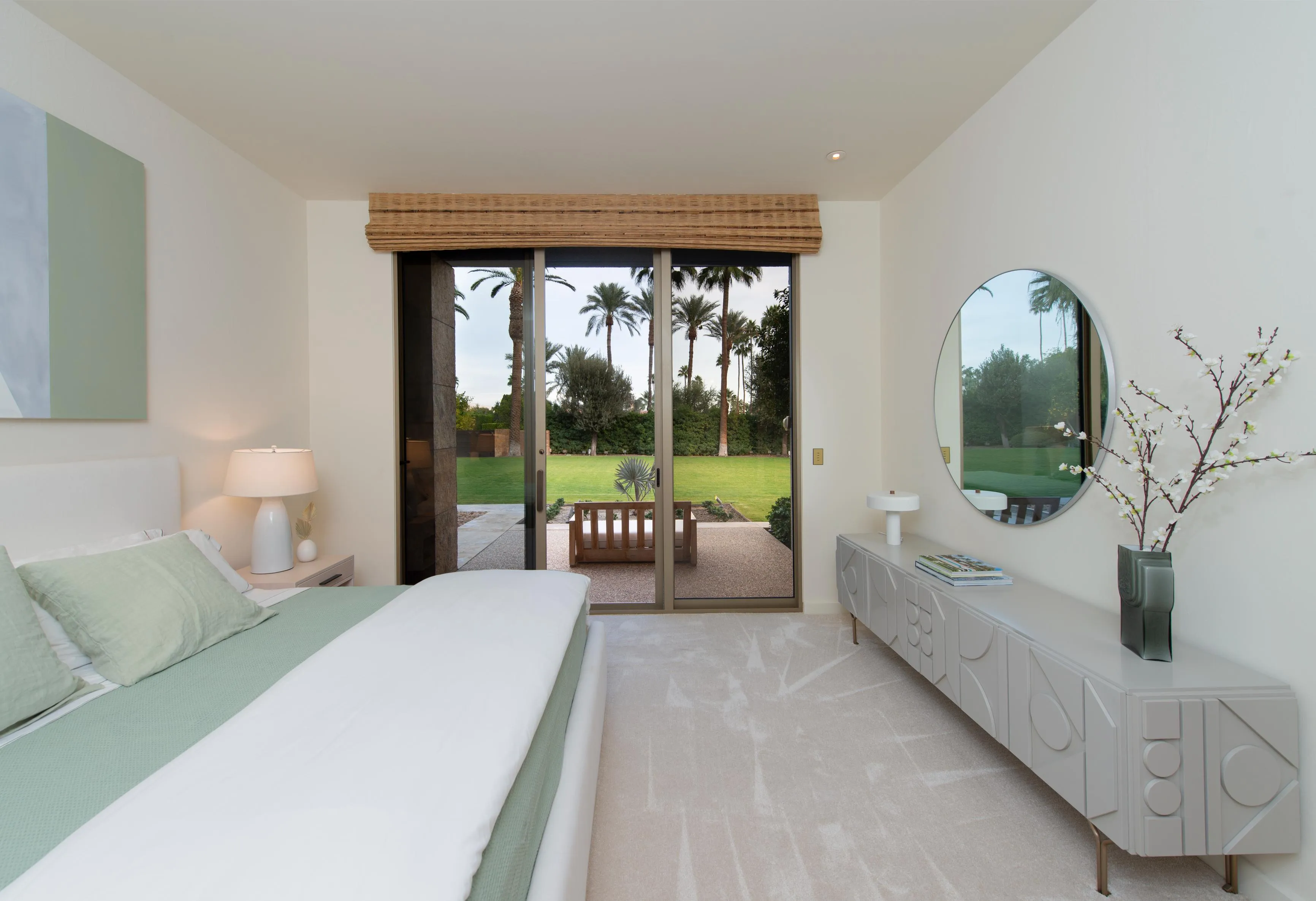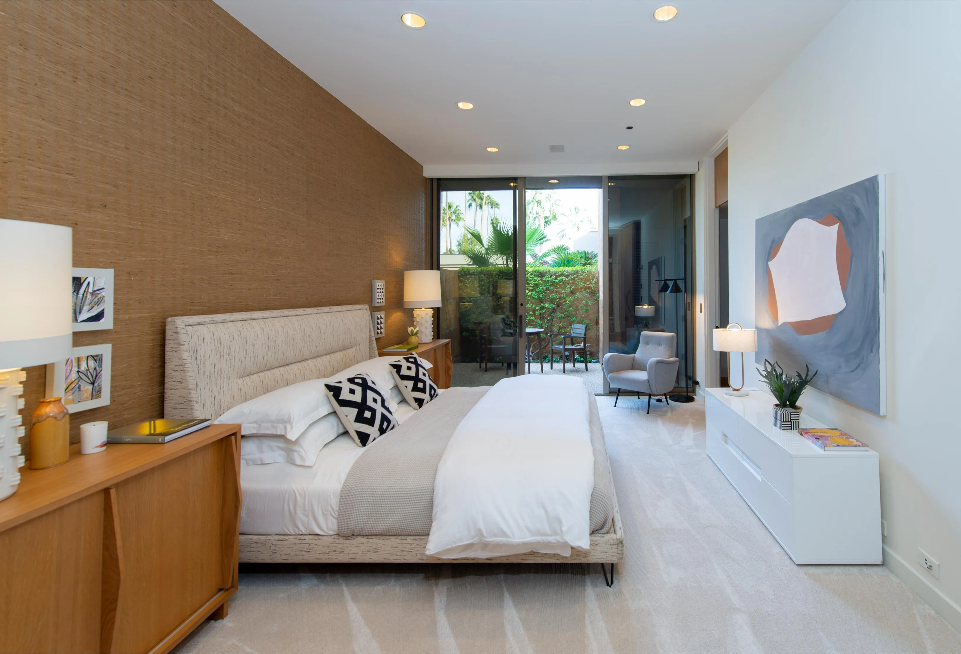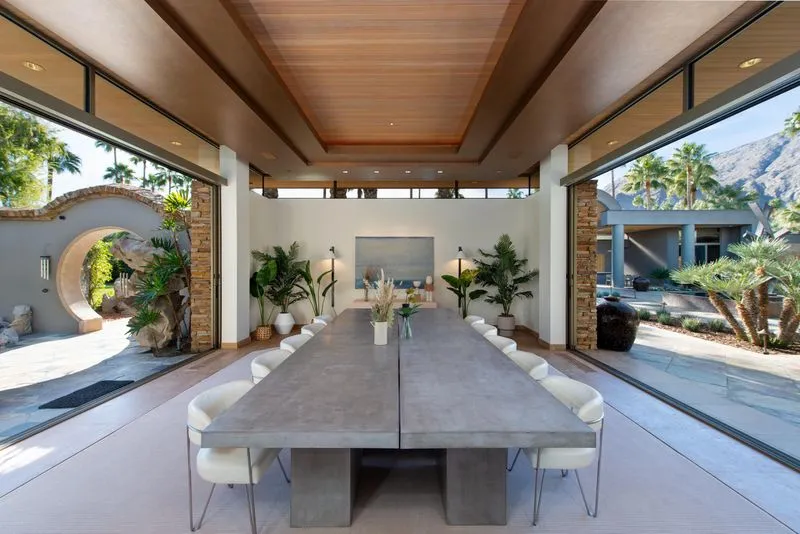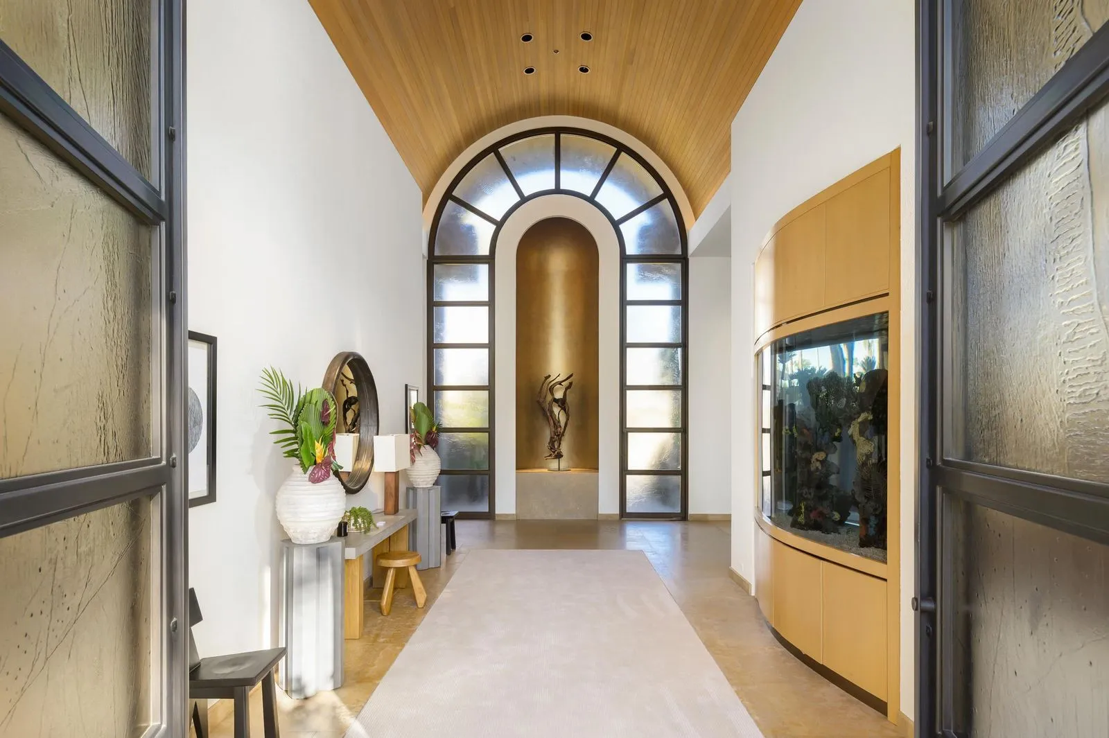 This extraordinary 1.5-acre estate is unparalleled in its distinctive style and resort-caliber amenities. Designed to celebrate light and art, it is truly irreplaceable, an oasis of tranquility that includes a one-of-a-kind five-bedroom residence, caretaker's quarters, and two chic one-bedroom guesthouses. Surrounded by towering palms, the home was constructed by superior craftsmen, has been thoughtfully rejuvenated, and boasts striking lines, angles, and details from around the world. It is an ideal venue for entertaining, with a climate-controlled wine cellar, a bar, and living and dining areas where glass pocket doors blur the line between indoors and out. The idyllic grounds offer sunny patios, numerous water features, fruit trees, swaths of emerald lawn, a koi pond enveloped by Taihu stone, and a secluded swimmer's pool and spa. The estate has been equipped with a security system, a gated motor court, a Crestron home-automation system, and an air-conditioned four-car garage.
