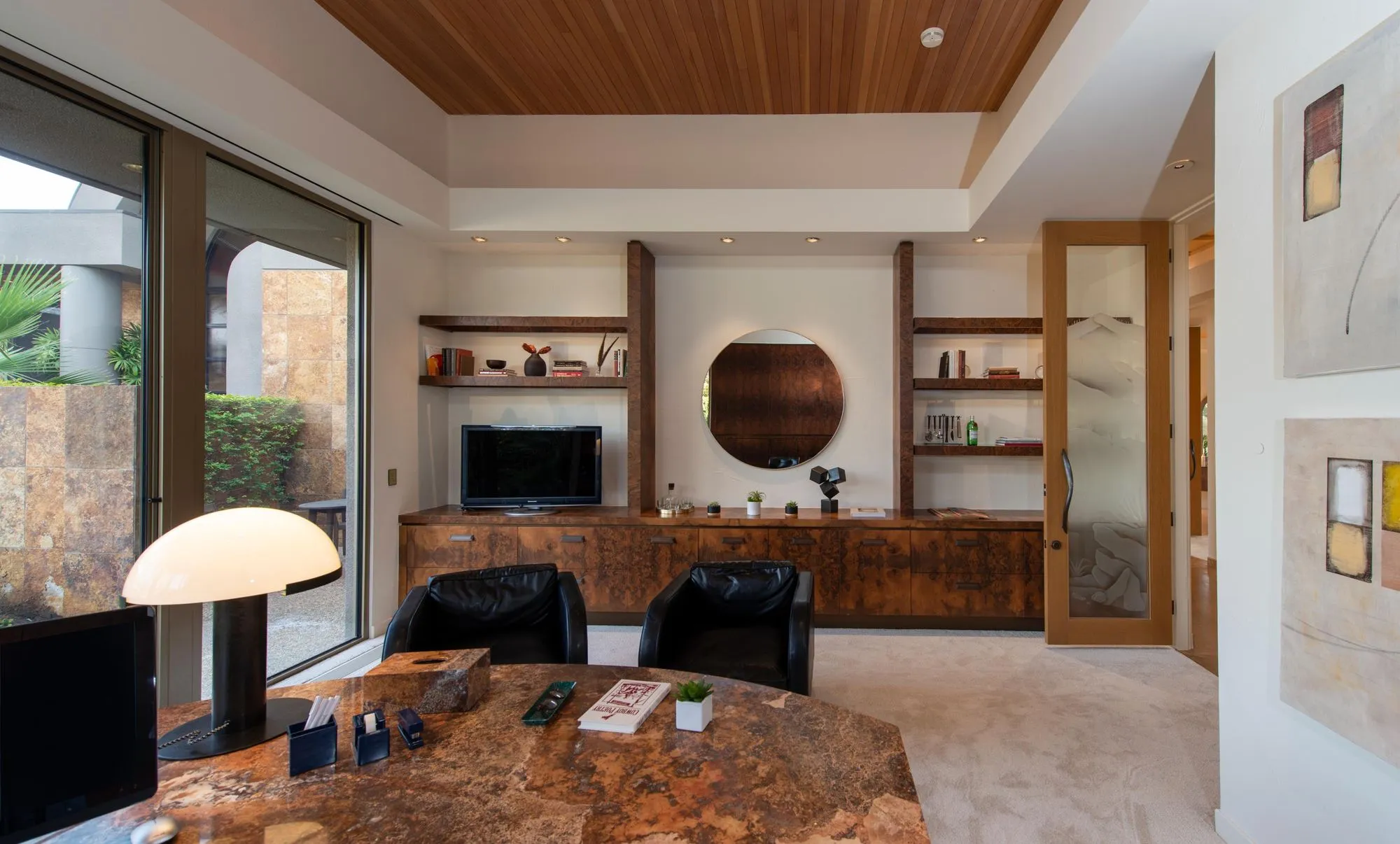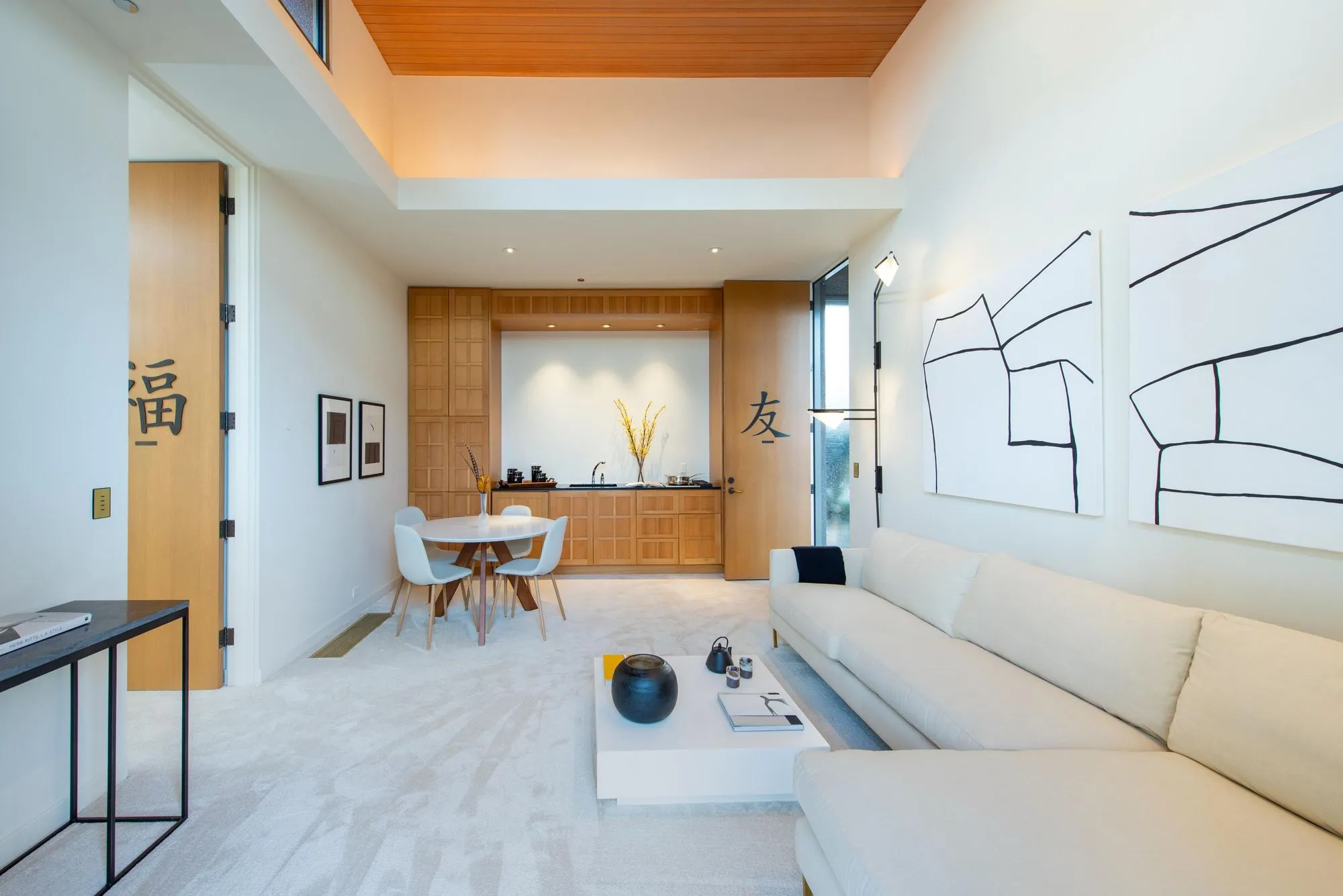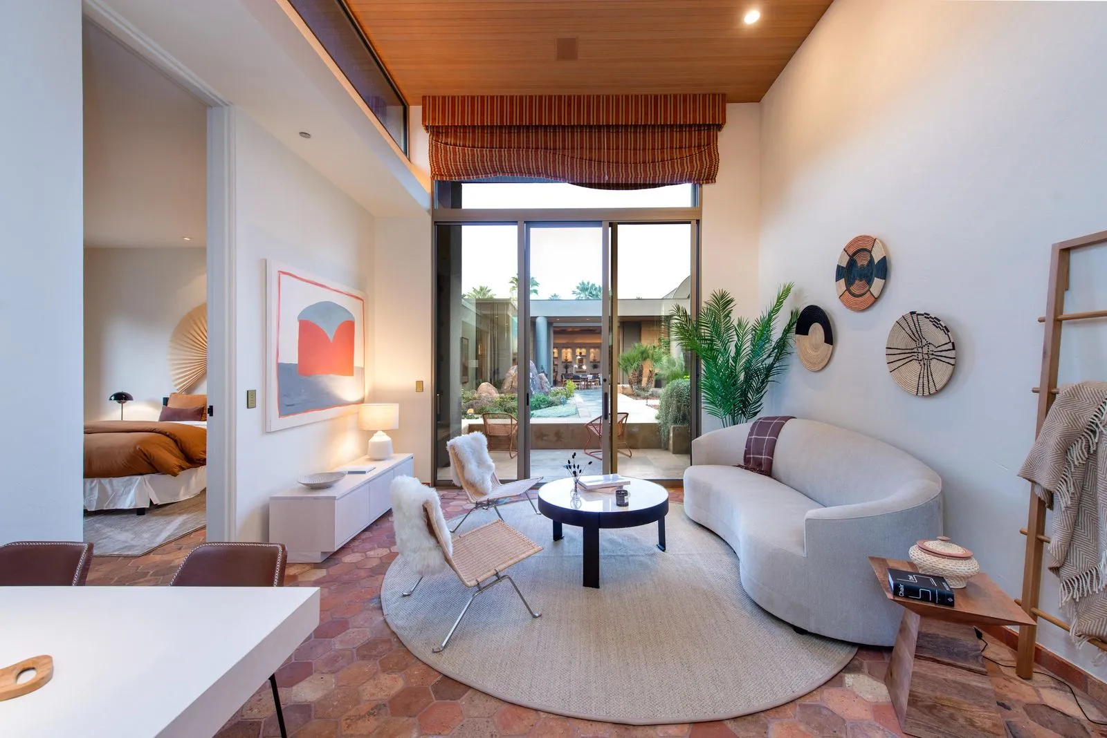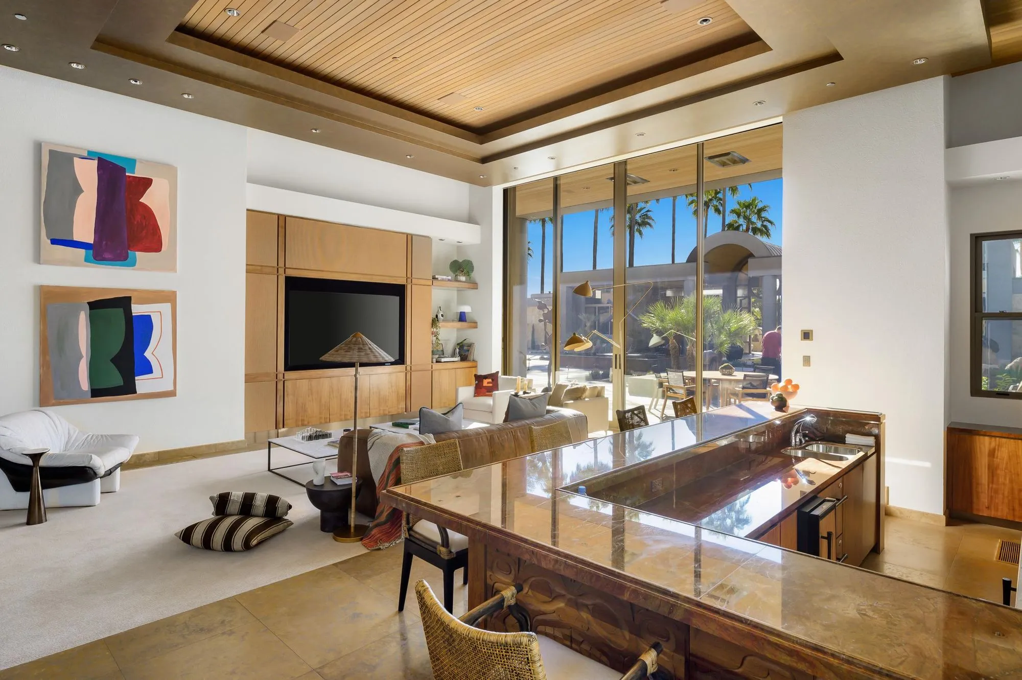 This extraordinary 1.5-acre estate is unparalleled in its distinctive style and resort-caliber amenities. Designed to celebrate light and art, it is truly irreplaceable, an oasis of tranquility that includes a one-of-a-kind five-bedroom residence, caretaker's quarters, and two chic one-bedroom guesthouses. Surrounded by towering palms, the home was constructed by superior craftsmen, has been thoughtfully rejuvenated, and boasts striking lines, angles, and details from around the world. It is an ideal venue for entertaining, with a climate-controlled wine cellar, a bar, and living and dining areas where glass pocket doors blur the line between indoors and out. The idyllic grounds offer sunny patios, numerous water features, fruit trees, swaths of emerald lawn, a koi pond enveloped by Taihu stone, and a secluded swimmer's pool and spa. The estate has been equipped with a security system, a gated motor court, a Crestron home-automation system, and an air-conditioned four-car garage.
